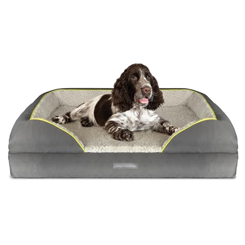 Dreamcatcher Dog Bed Large Plus 97x71x20cm, Orthopaedic Memory Foam Bolster and Non Slip Base with Sherpa Fleece Top. Grey Waterproof Oxford Fabric Sides and Removable Washable Cover