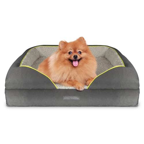 Dreamcatcher Small Dog Bed 65x40x20cm, Orthopaedic Memory Foam Bolster and Non Slip Base with Sherpa Fleece Top. Grey Waterproof Oxford Fabric Sides and Removable Washable Cover