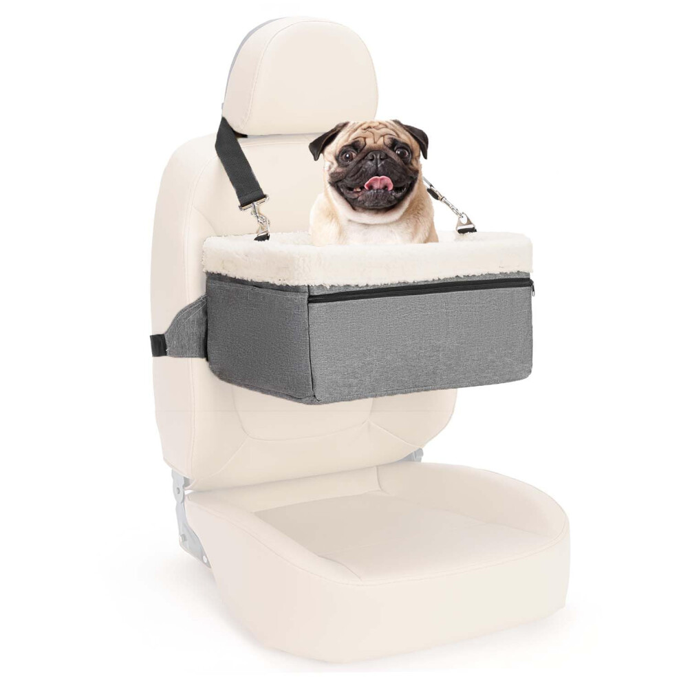 GoFirst Dog or Cat Booster Seat - Travel Car Bed with Storage Pocket, Clip-On Safety Leash, Waterproof Warm Plush, Grey