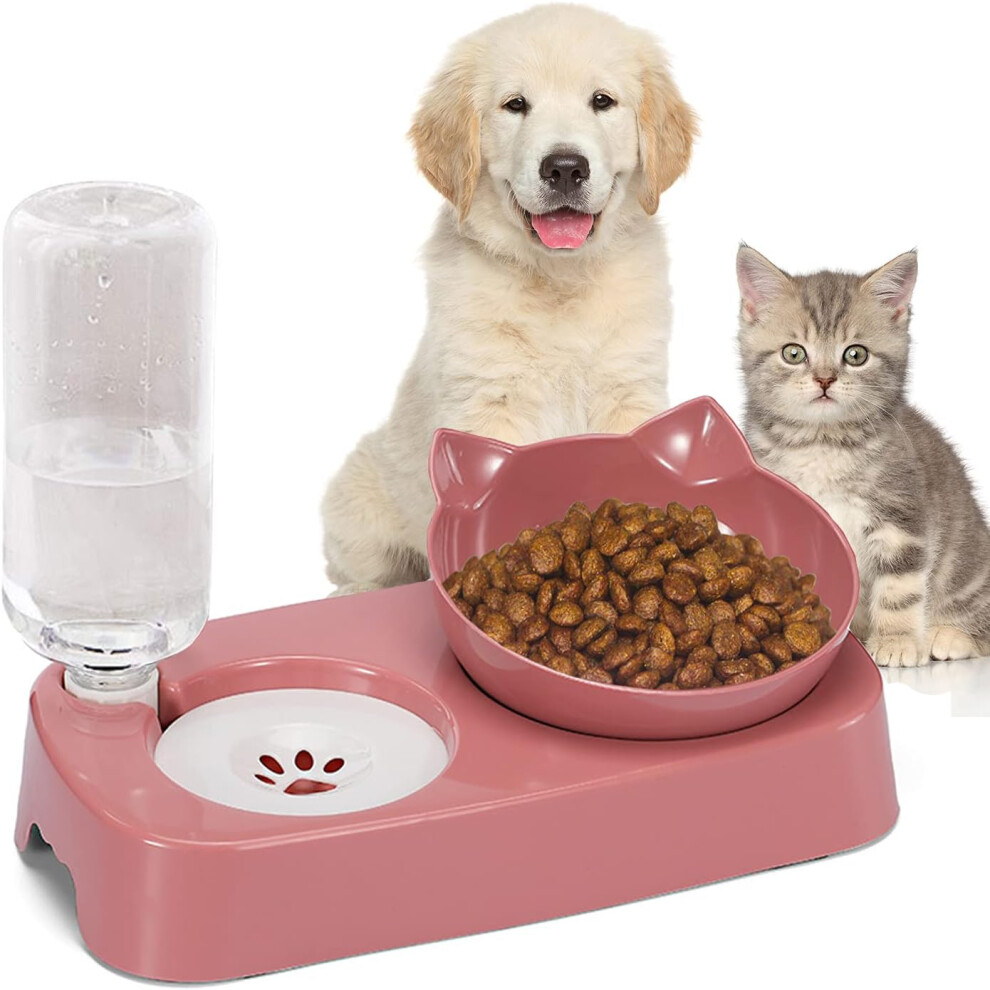 in 1 Cat Bowls, Cat Bowl with Automatic Water Dispenser, Double Bowl Feeder Cat Dog Bowl with Stand, 15¡ã Tilt, Cat and Small Dog Bowls