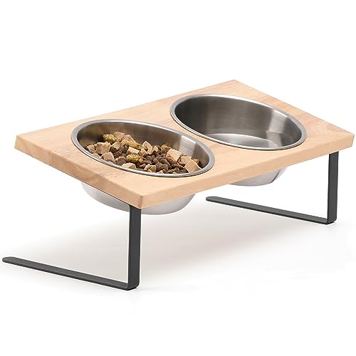 Elevated Cat Bowls, Small Dog 15° Tilted Raised Stainless Steel Bowl Stand, Solid Bamboo Food Water Bowl Set Feeding Station for Pets
