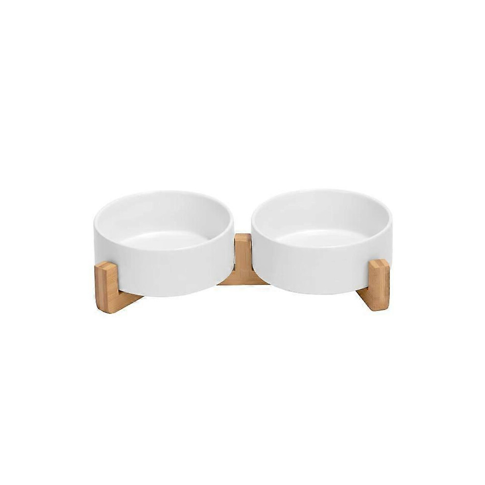 (As show, One size) Ceramic Dog Bowl Double Dog Feeding Bowl with Bamboo Stand for Cats and Dogs (400ml, White)