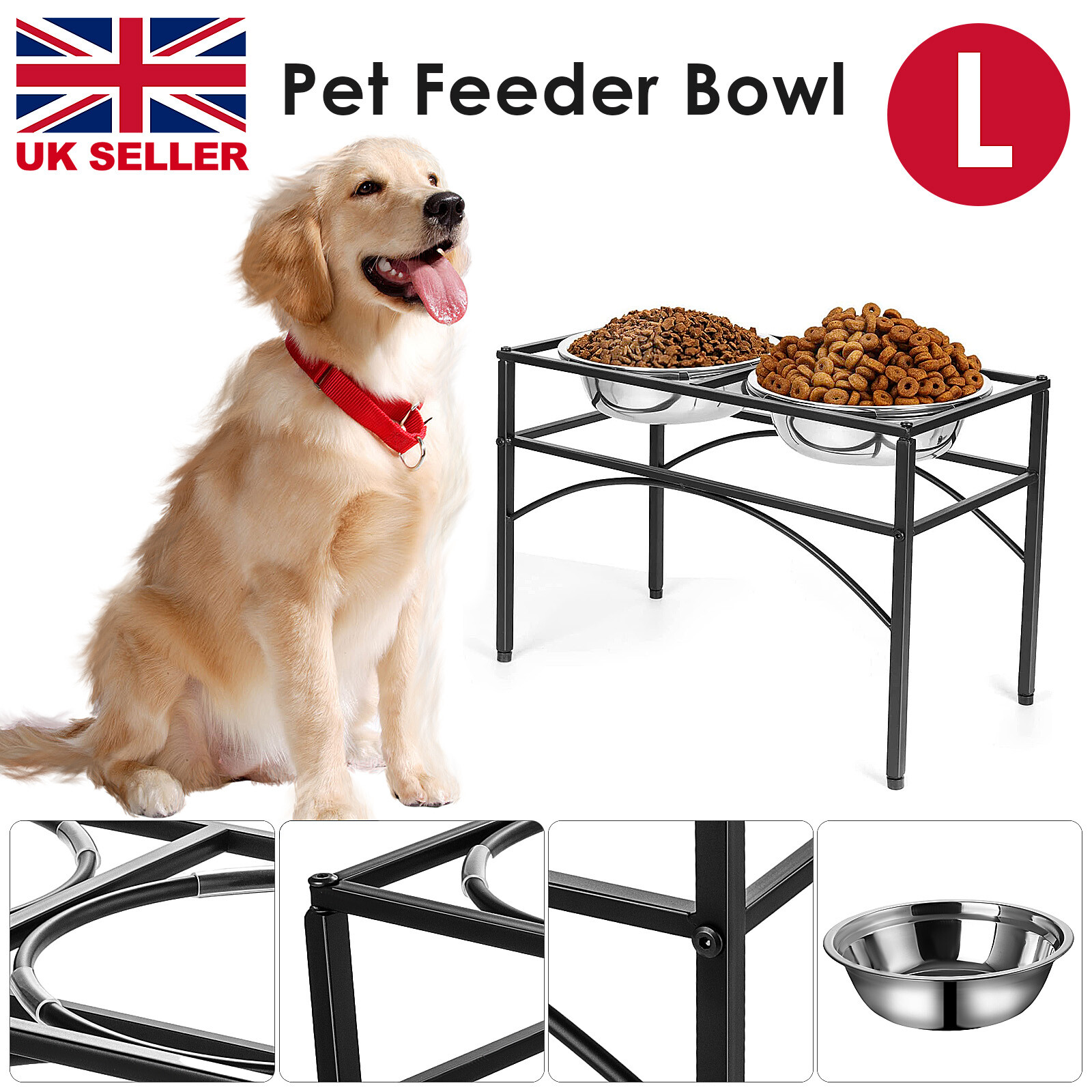 L Double Bowl Dog Cat Feeder Elevated Raised Stand Feeding Food Water Pet Dish