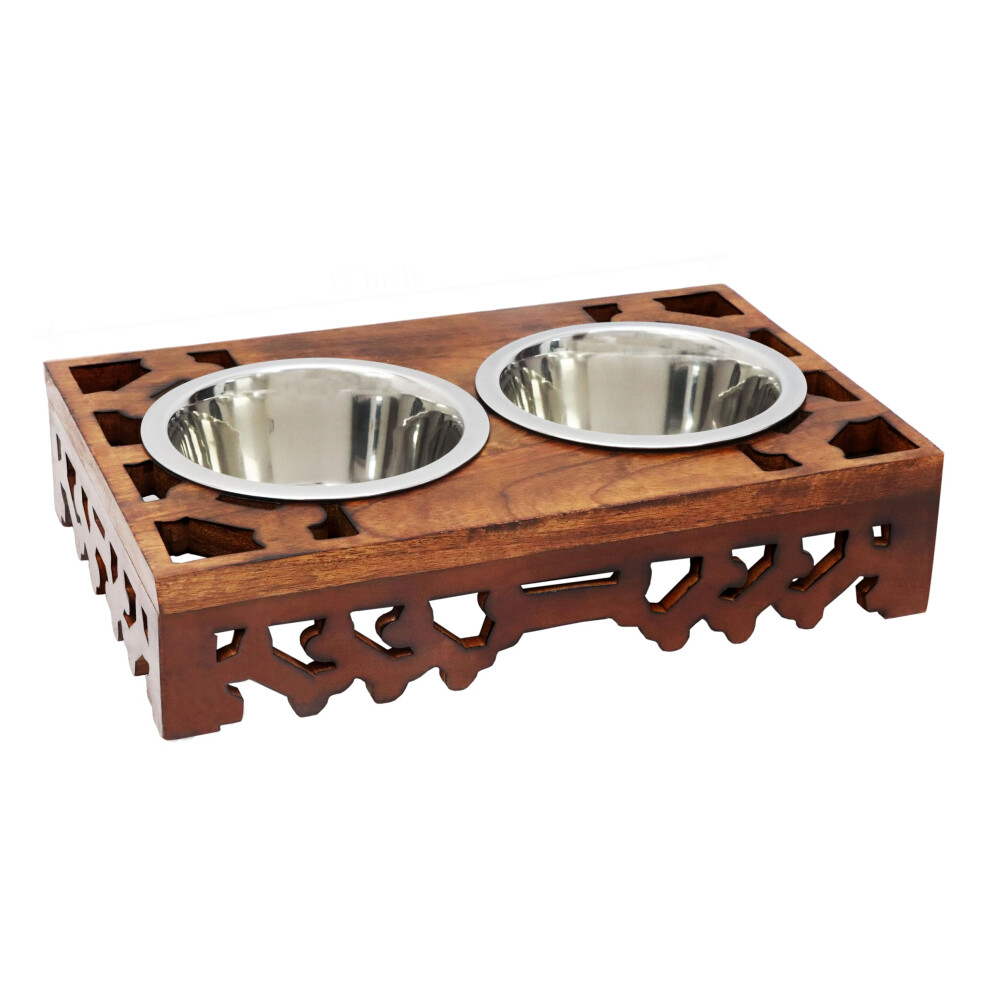 Elevated Pet Feeder for Dogs and Cats - Hand Carved Wood Bones Raised Dog Bowl Stand - Pet Feeding Stand with Two Steel Bowls - Raised Dog Bowl for Fo