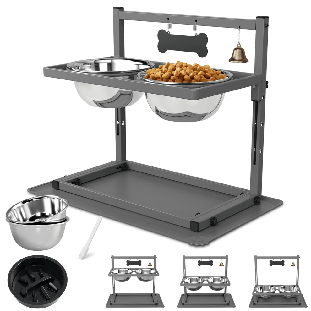 SHAINFUN Grey Raised Dog Bowl Stand with Two 1700ml Stainless Steel Food Bowl a Slow Feeder and Silicone Pet Feeding Mat Adjustable Dog Feeder Elev