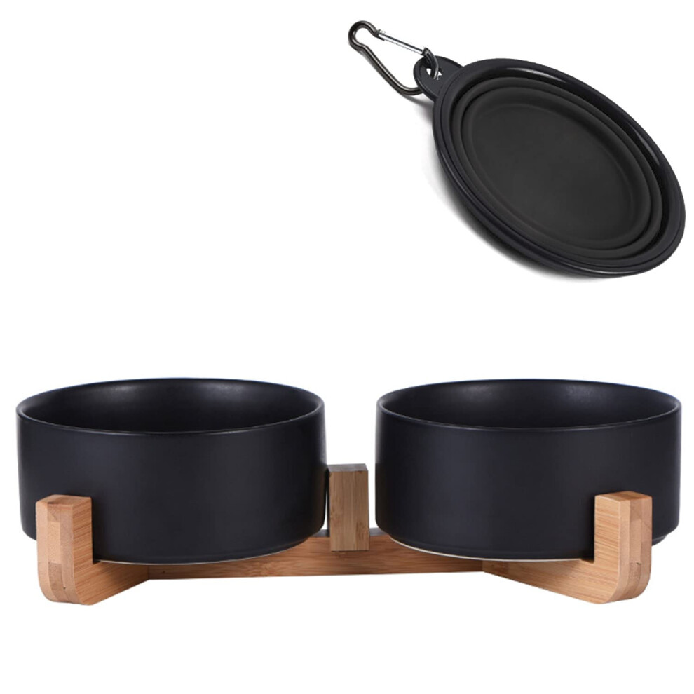 Petygooing Dog Bowls Black Ceramic Cat Dog Bowl Set with Wood Stand for Food and Water Non-Slip Cute Modern Pet Dish Set for Cats & Medium Dogs (28OZ/