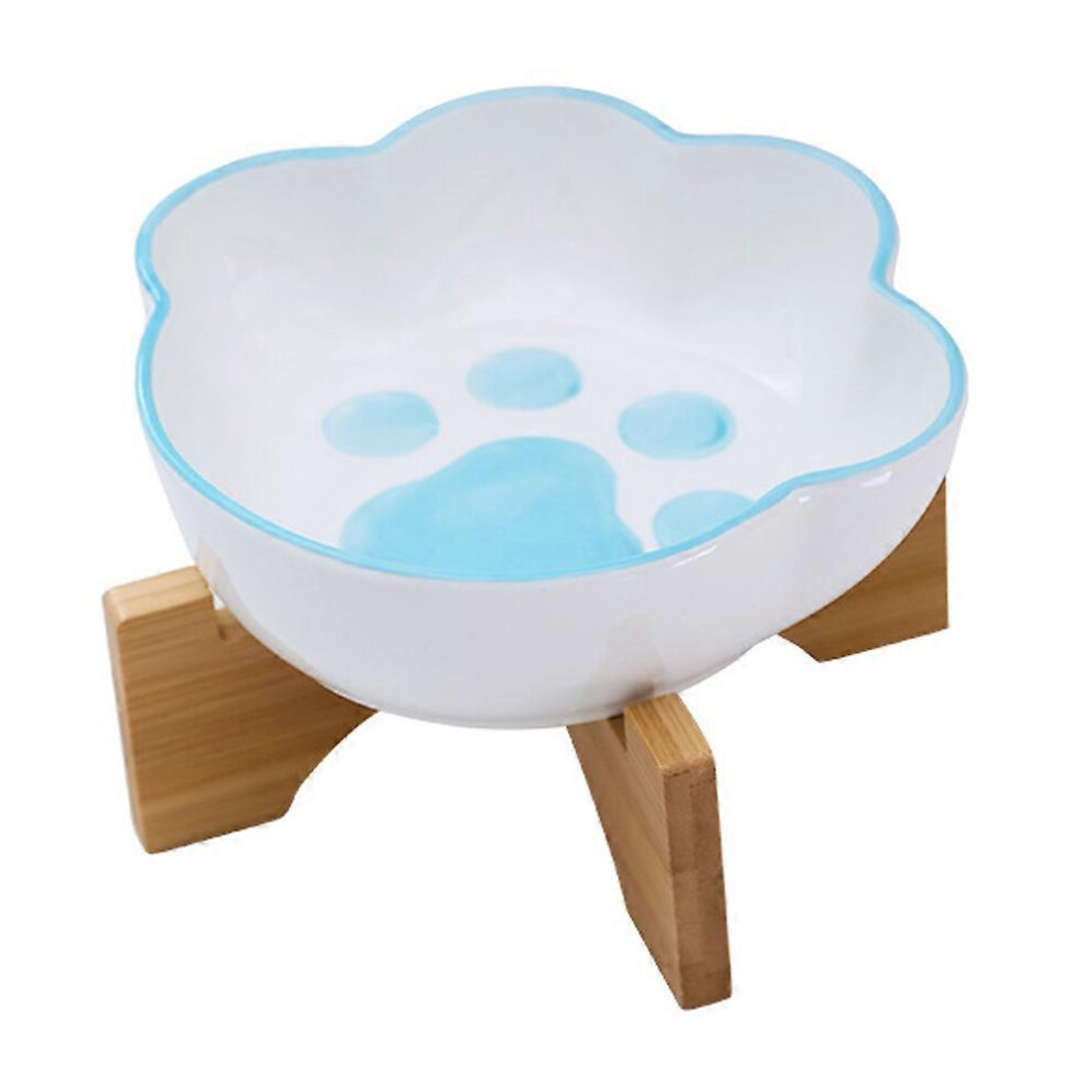 (blue, One size) Ceramic Cat Dog Food Bowl with Wood Stand Non-Slip Cute Food and Water Bowls