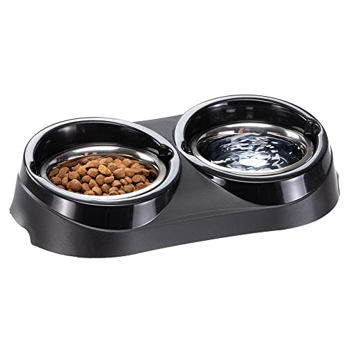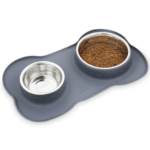 Pecute Dog Bowls Non Slip, Stainless Steel Double Bowls Set with Non-Spill Silicone Mats Tray for Cats Puppies Small Dogs Water Food Feeding (14oz Each Bowl, Grey)