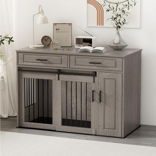 DAWNYIELD Furniture Style Dog Crate, Wooden Crate with Sliding Doors, Dog Kennel with 2 Drawers and Storage Cabinet, 2 Doors Pet Cage End Table for Medium/Large Dogs, Indoor Pet House, Grey