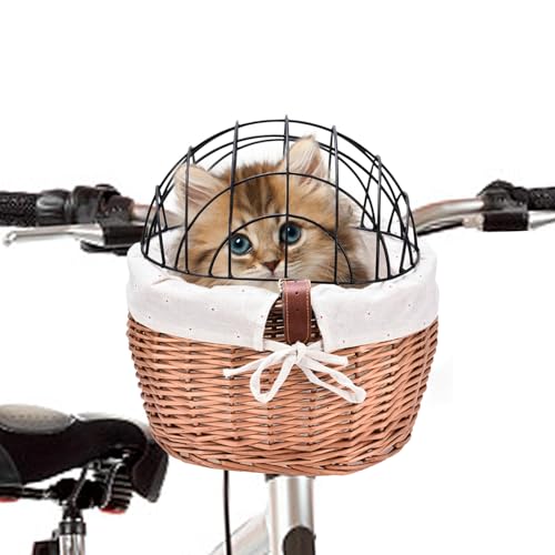 Pet Bicycle Carrier, Handwoven Willow Front Basket with Protective Wire Lid, Removable Dog and Cat Carrier, Comfortable Bike Riding Accessories for Small Pets, Easy Installation