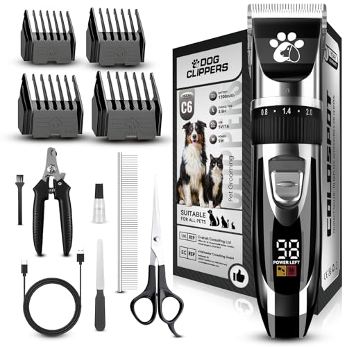 Dog Clippers Cordless, Dog Grooming Kit, Low Noise Rechargeable LED Display Pet Trimmer (Black)
