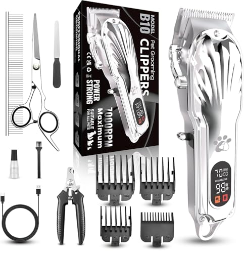 Dog Clippers Professional for Thick Hair, Pet Clippers for Dogs Cordless LED Display Low Noise Rechargeable Dog Trimmer with Grooming Nail Kits (Silver)