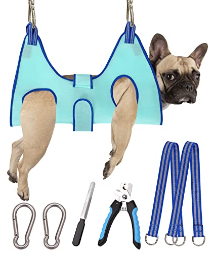 Kkiimatt Dog Grooming Hammock Harness with Nail Clippers, Blue, Large