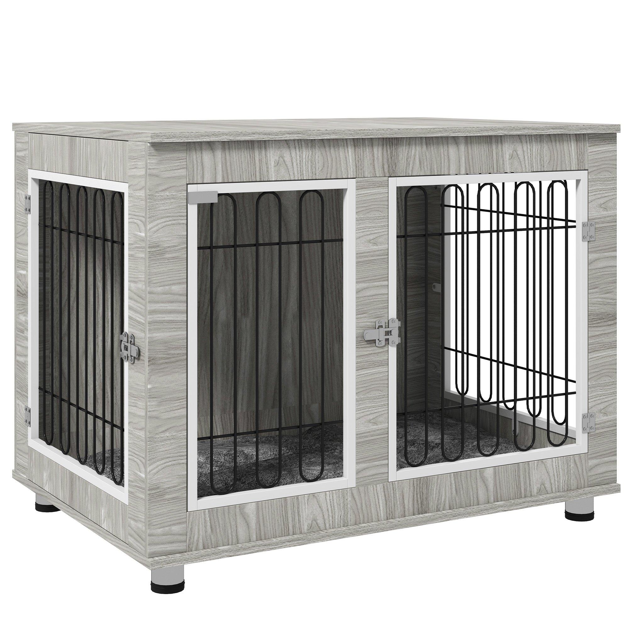 Dog Crate Furniture, Dog Crate End Table w/ Soft Cushion, Double Door - Grey