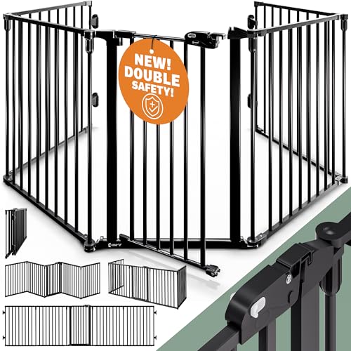 COMOMY 380cm Extra Wide Baby Gate, Dog Gates for Stairs Doorways, Fire Guard Safety Gates for Kids&Pets, Auto Close Baby Fence Barrier Indoor with Door, Hardware Mounted, 6-Panels (76cm Tall, Black)