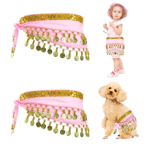 Baisdan 2 Pcs Belly Dance Hip Scarf for Kids Dogs, Belly Dance Skirt with Sequin Coin, Dog Costume for Halloween、Birthday Parties and Cosplay Pink