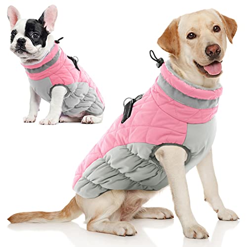 Lelepet Warm Coats and Jackets for Dogs, Waterproof Winter Dog Coat for Cold Weather, Reflective Dog Puffer Jacket, Fleece Lining Pet Coat with Harness Hole for Large Dogs, Pink XL