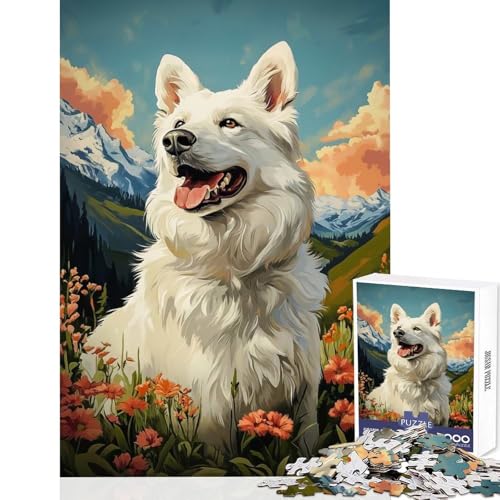 1000 Teenager Pieces Jigsaw Puzzle White Swiss Shepherd Dog in Mountain Meadow Toy Wall Decor Gift Birthday Practical Game Interesting Stress Reduction Size 38x26cm