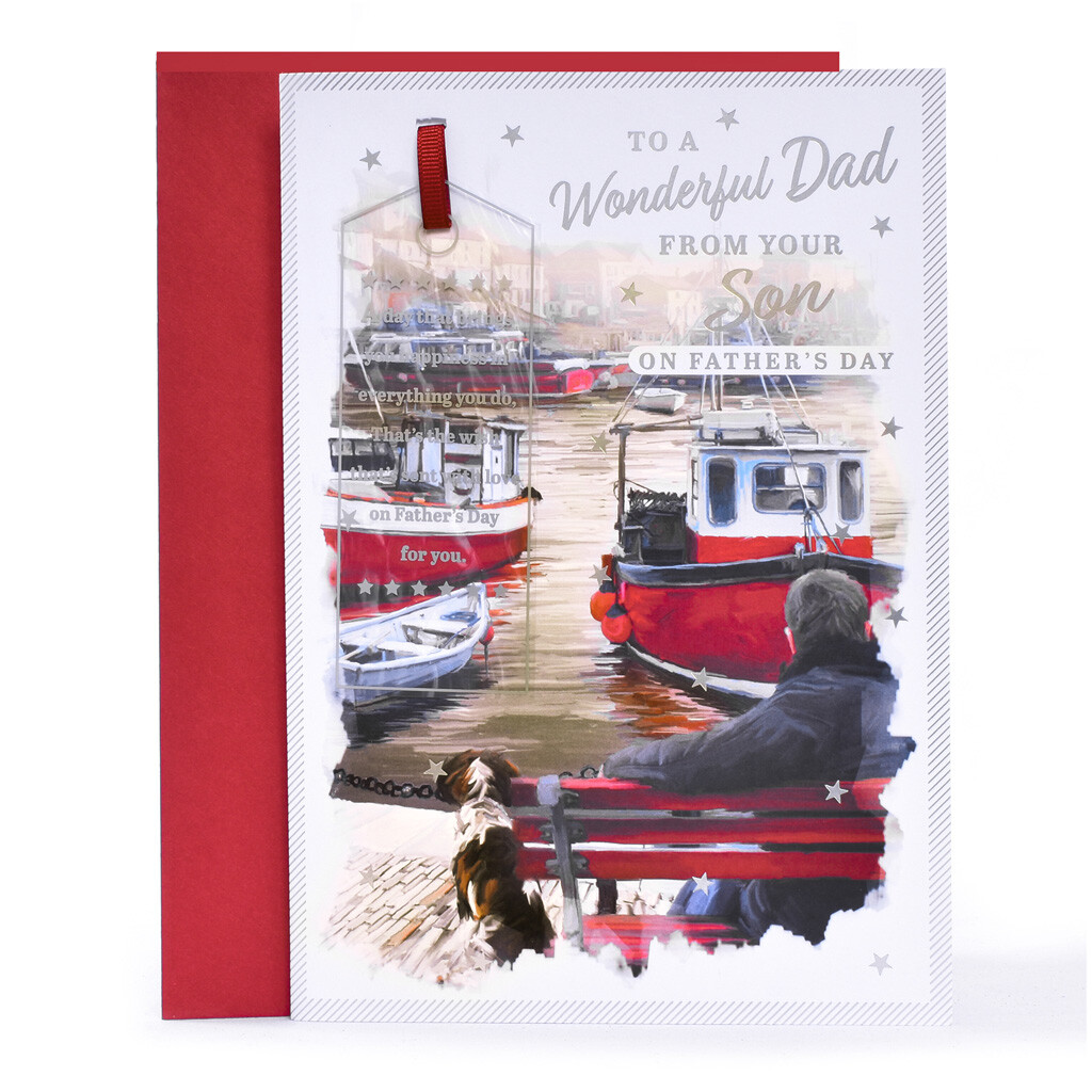 Dad Father's Day Card - Man & Dog by Harbour Scene Silver Foil 9.5x6.75"