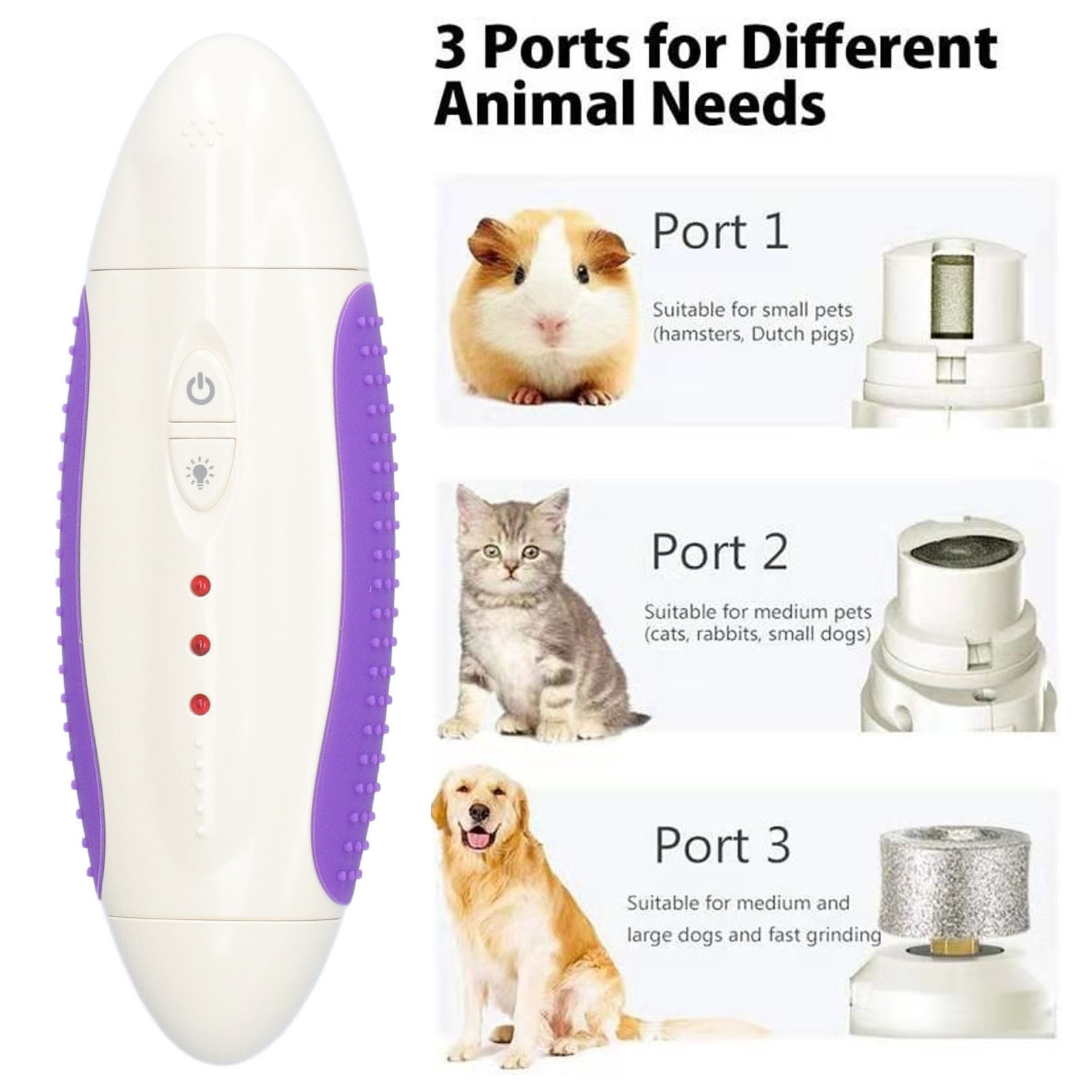 Dog Nail Grinder 3 Ports Rechargeable Low Vibrations Pet Nail Trimmer