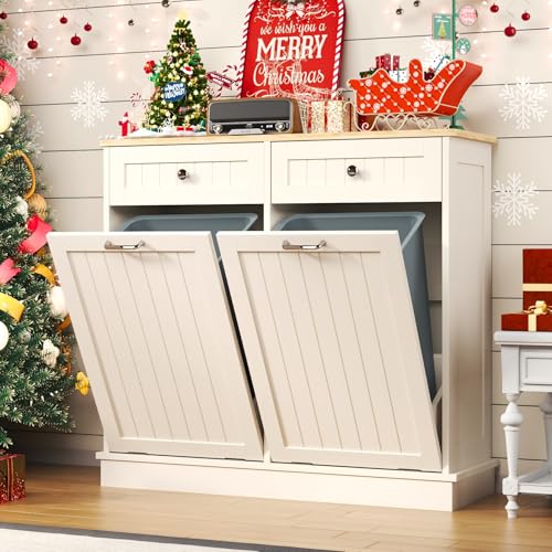 LOUVIXA Tilt Out Trash Bin Cabinet Dog Proof Trash Can Holder with Two Solid Wood Hideaway Trash Holder Drawers, Free Standing Recycling Cabinet