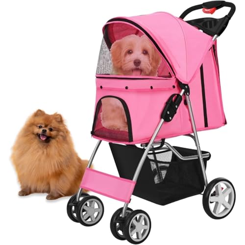 Pet Stroller, Dog Cat Pushchair - Folding with 4 Lockable Wheels, Safety Belt, Adjustable Canopy, Mesh Windows, Storage & Cup Holder for Small Medium Pets (15kg Capacity)(Pink)