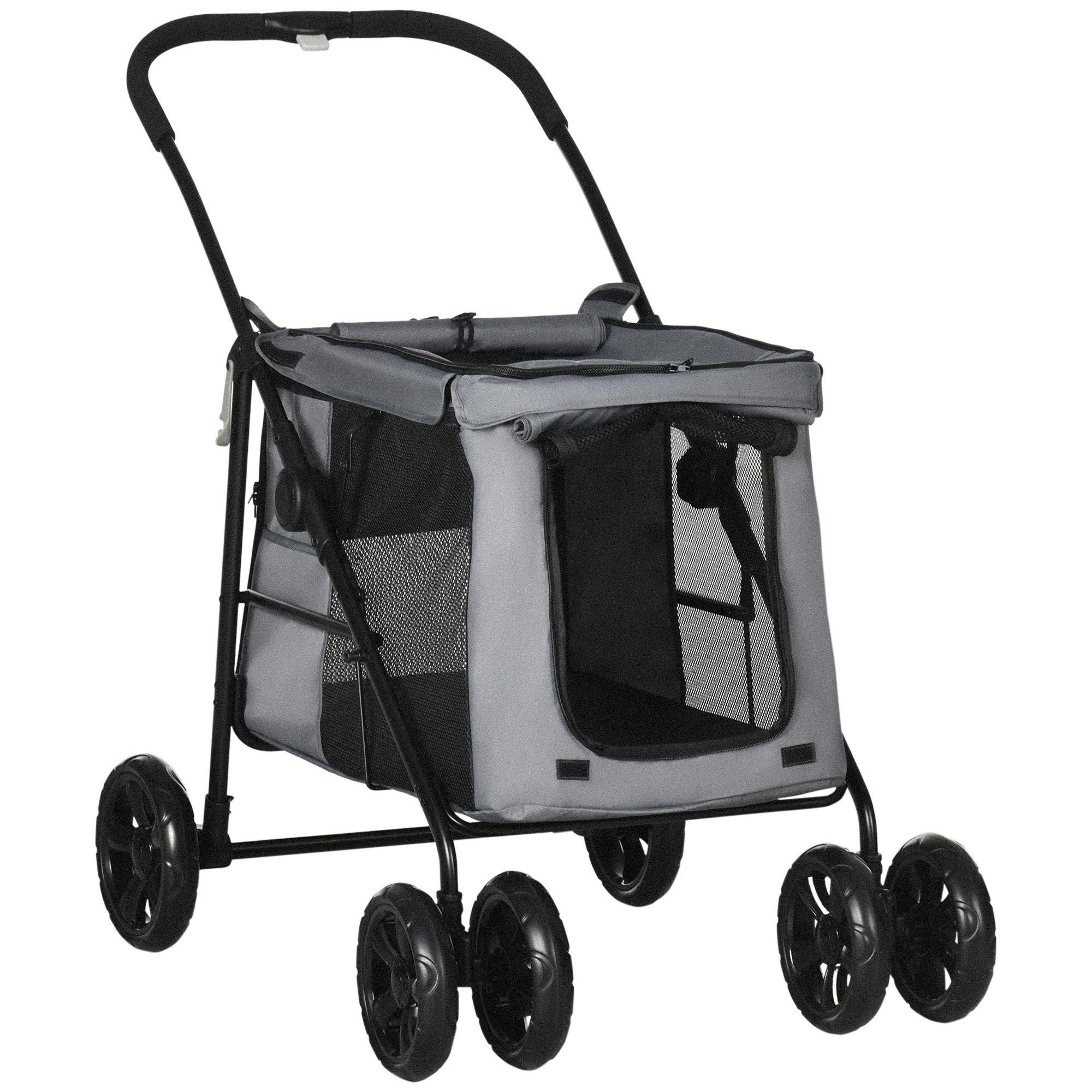 Pawhut Dog Pram Pet Stroller Dog Pushchair Foldable Travel Carriage With Wheels Zipper Entry Cup Holder Storage Basket Grey