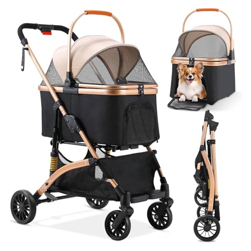 Foldable Pet Stroller - 3 in 1 Dog Cat Pushchair With Storage Basket, Net Window, Cup Holder, 360° Wear-Resistant Rubber Wheels - Travel Carrier for Small Dogs & Cats, Champagne