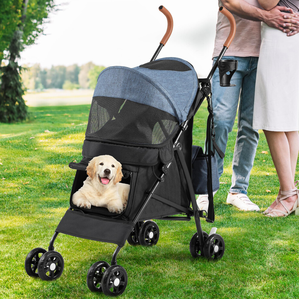 One-Click Foldable Pet Stroller, Dog Cat Travel Pushchair with EVA Wheels, Storage Bags, Mesh Windows, Doors, Safety Leash, Cushion, for Small Pets