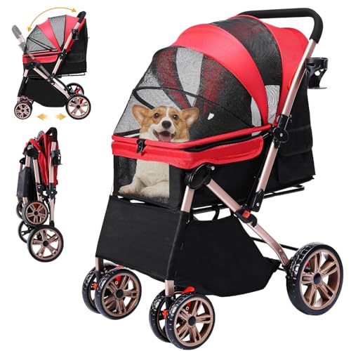 DWVO Dog Stroller, Pet Pram for Small Medium Dogs 22kg, Dog Buggy with Storage Basket Cup Holder, Cats Dogs Pushchair, Foldable Pet Strollers for Cats Puppies Dogs (Red)
