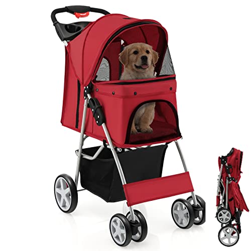 Costway 4-Wheel Pet Stroller Folding Dog Cat Walk Travel Pushchair with Basket