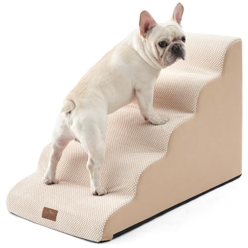 COZY KISS Wide Dog Stairs, Small Pet Steps with Leakproof Cover, High Density Foam Cat Ramp for High Bed Car, Lightweight, Durable, 19.7x33x22.4 inch, 5 Tiers, Beige