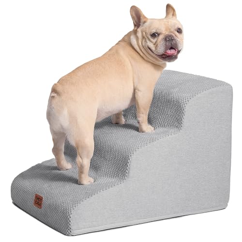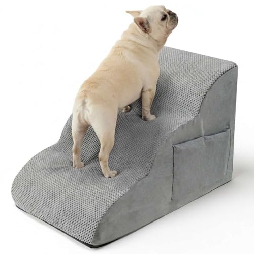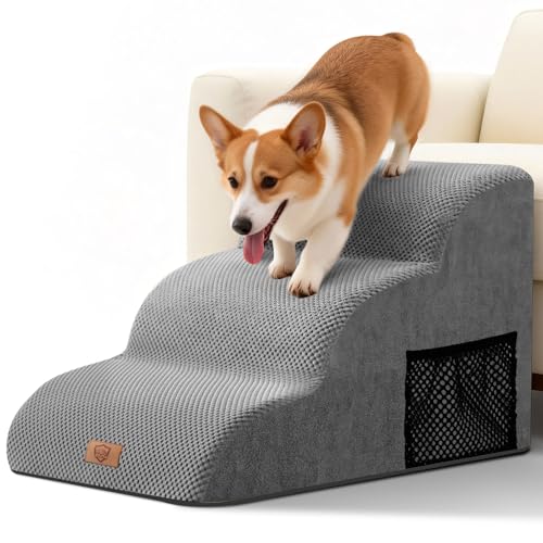 EHEYCIGA Curved Dog Steps for Bed, 3-Step Dog Stairs for Sofa, High Density Foam Pet Steps for Small Dogs and Cats, Pet Stairs for Couch, Non-Slip Dog Ramp with Washable Cover, 40x57x40cm, Light Gray