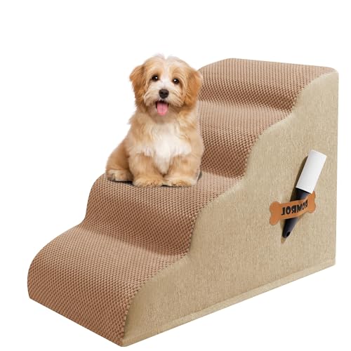 ROMROL Dog Stairs for Small Dogs, 4-Step Non-Slip Pet Ramp for Bed & Sofa – High-Density Foam, Removable Washable Cover – Soft Dog Steps for Puppies, Senior Dogs & Cats, 58x38x38cm, Brown