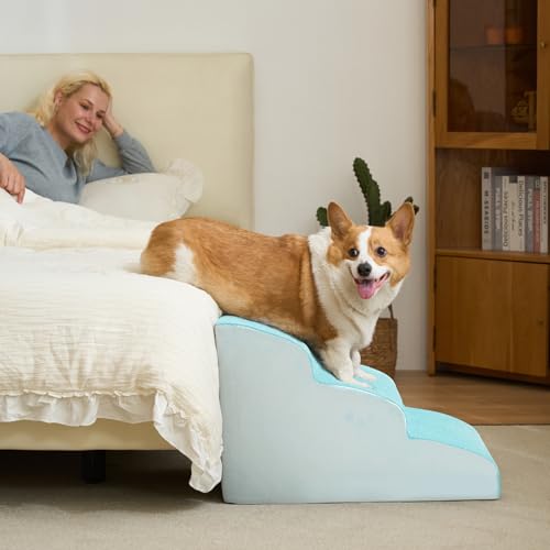 Dripex Curved Dog Stairs for Beds Couches, 3-Step Dog Steps with Durable Non-Slip Fabric Cover, Dog Slope Stairs for Small Dogs, Cats or Pets Friendly, Blue