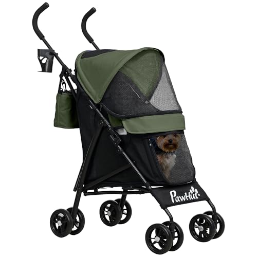 PawHut Pet Stroller for Miniature Dogs, Foldable Dog Stroller with Shoulder Strap, 4 Wheels Pet Pram with Storage Bag, Cup Holder, Dark Green