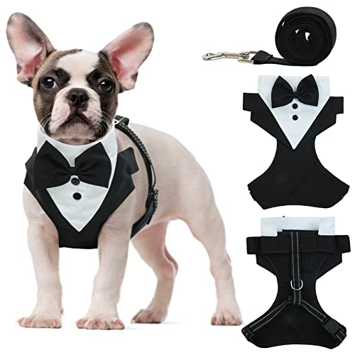 OUOBOB Tuxedo Dog Harness, Dog Vest with No Pull Dog Leash, Formal Puppy Harness with Bow Tie for Wedding, Breathable Mesh Dog Tuxedo Vest Harness, Pet Harness for Small Medium Dogs, Birthday Walking