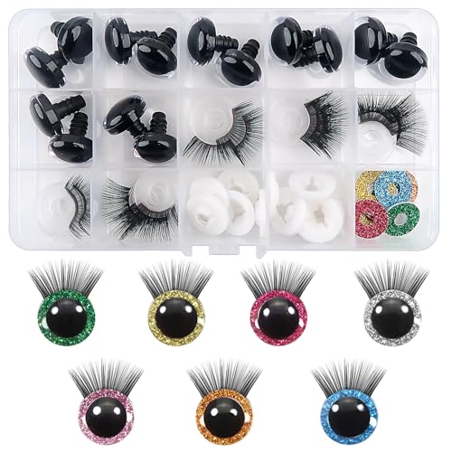 Amentalove 40PCS Glitter Safety Eyes with Eyelashes, Plastic Safety Eyes for Crochet Toys, 12-20mm Crochet Eyes with Noses Washers for Amigurumi, Craft Safety Eyes for Animals Teddy Doll Plush Toy