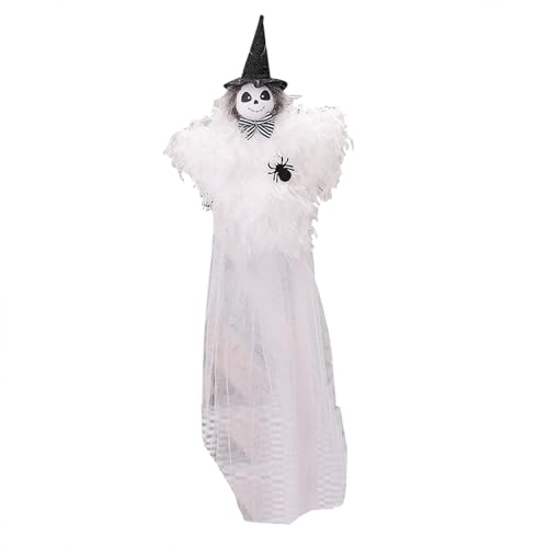 Halloween Witch Doll Statue Sitting Decoration Outdoor Hanging Flying Yard Garden Ornament Party Props Dress (White, 19x4x45cm)