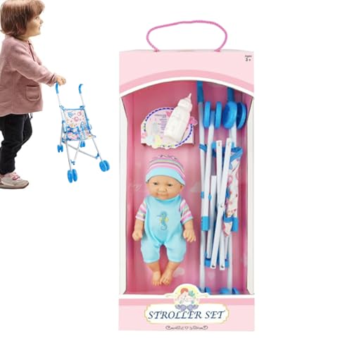 Foldable Doll Stroller - 10-Inch Doll Pushchair, Pretend Nursery Set | Comes With Play Bottle, Portable Lightweight Construction For Kids Role Play, Care Learning Idea For Birthdays Holidays Fun