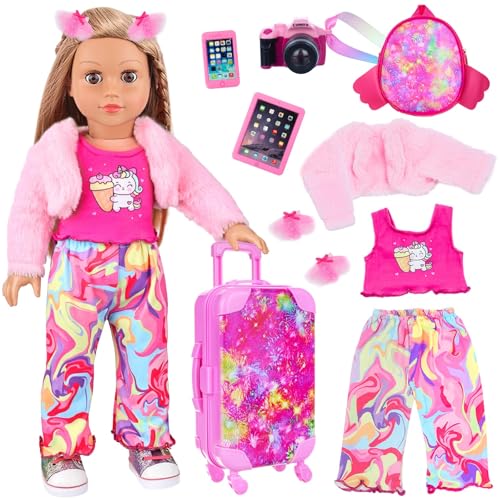 ZITA ELEMENT American 18 Inch Doll Clothes and Accessories Doll Suitcase Set, 10 Pcs Doll Travel Play Set with Doll Backpack Clothes Hair Clips Camera Computer Phone Fit 18 Inch Dolls Gift(no Doll)