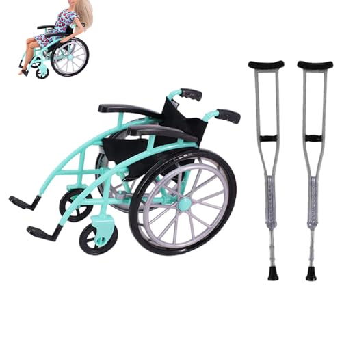 HOODANCOS Miniature Wheelchair and Crutch Doll Accessories for Collectors, Folding Small-scale Dollhouse Toy Set, Realistic Green Wheelchair Model for Doll Playsets and Decoration