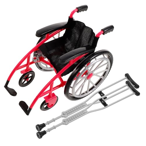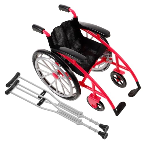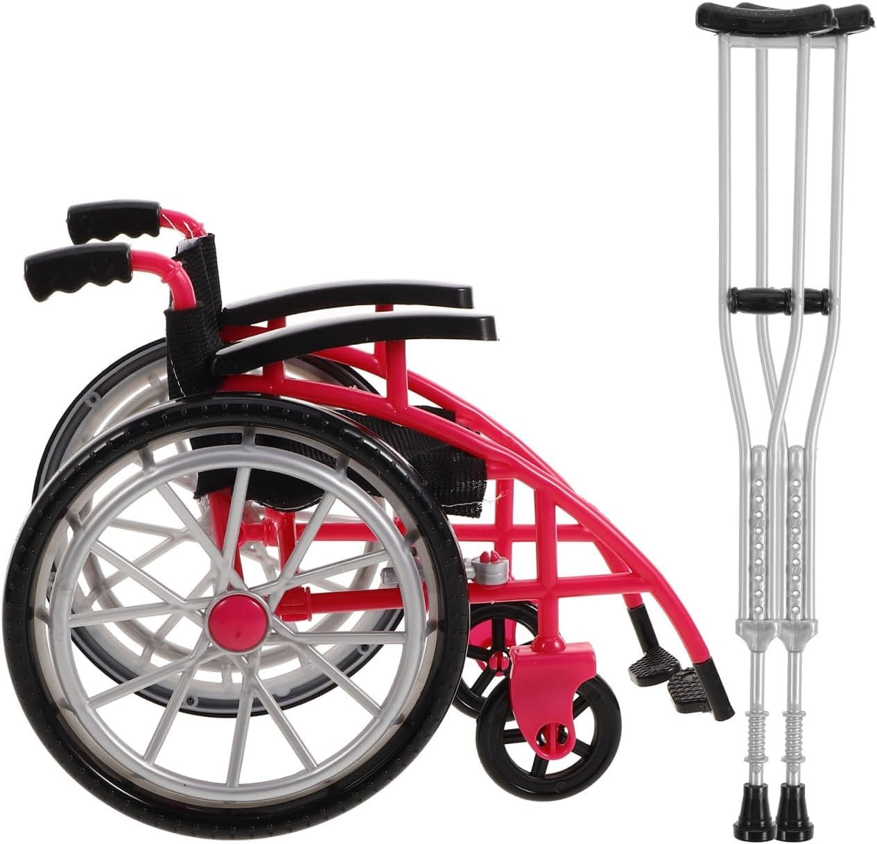 TOYANDONA 1 set of Doll Wheelchair and Crutches Playset Red Mini Wheelchair Model Miniature Wheelchair Crutch Ornaments for Kids Pretend Play Toy