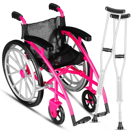 DOITOOL Mini Wheelchair And Crutches Toys, Doll Wheelchair Model Mini Crutch Ornament Dollhouse Accessory, Movable Wheel Chair Prop for Baby Play, Rosy