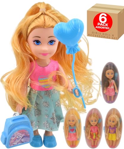 Electoys Pretty Doll in Case Toy Doll for Girls Collectible Miniature with Accessories Blonde Hair Blue Eyes Pink Top Blue Skirt Imaginative Play Small Size Egg Carry Case For Kids - 6 Pack