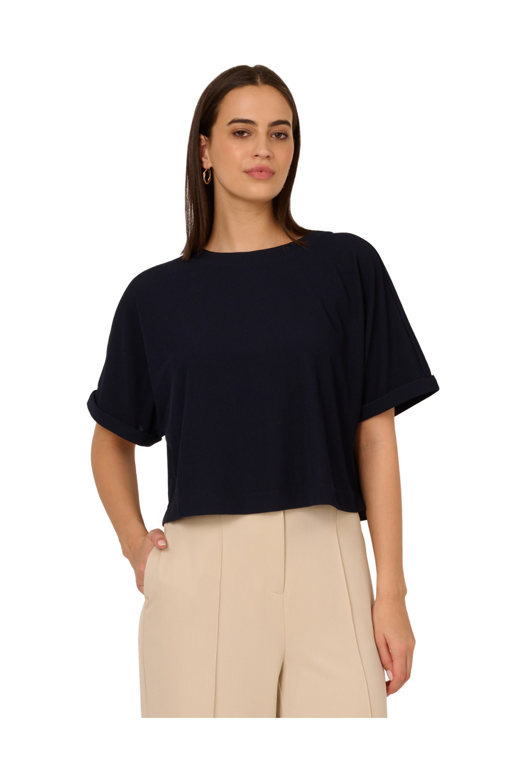 Adrianna Papell Womens Crew Neck Short Sleeve Dolman Boxy Rib Knit Crop Top - Blue - Size Small