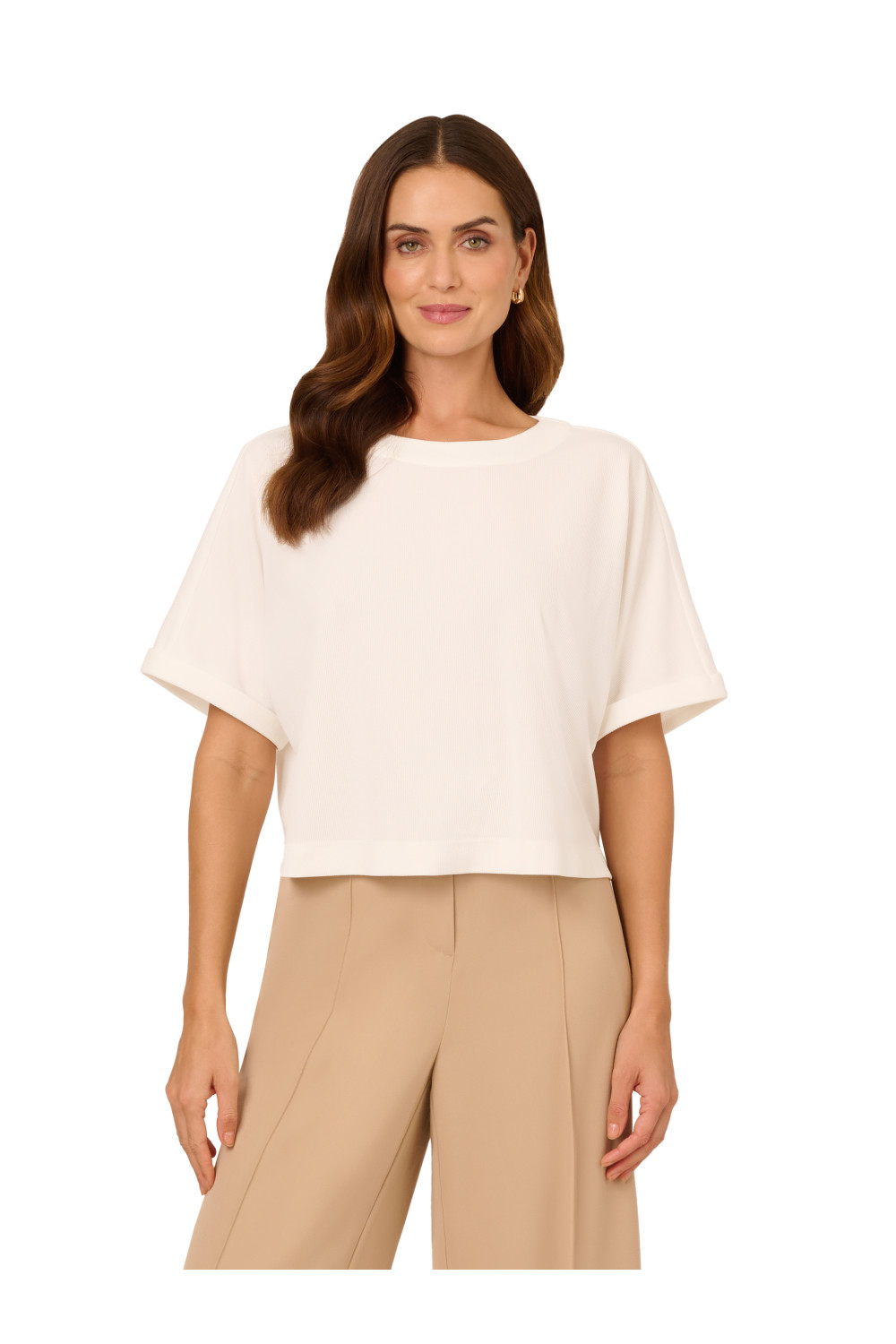 Adrianna Papell Womens Crew Neck Short Sleeve Dolman Boxy Rib Knit Crop Top - White - Size Large