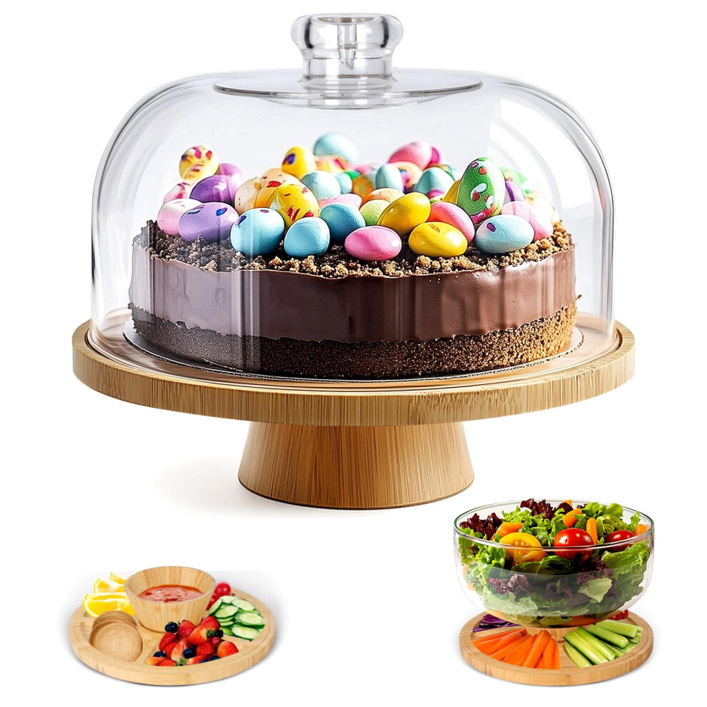 Masthome Cake Stand with Dome Lid,Wooden Cake Stand,Multifunctional 6 in 1 Clear Cake Plate for Snack Fruit Server Salad Bowl Kitchen Party BBQ