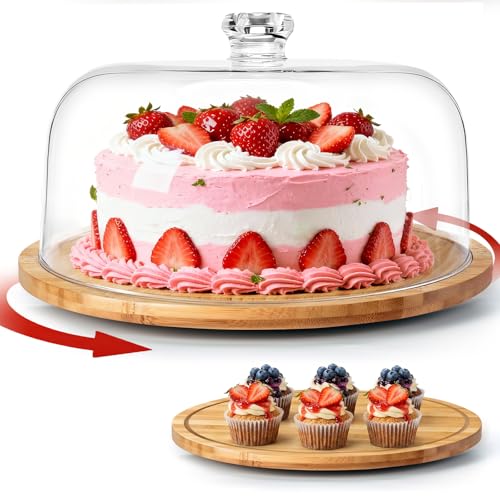 MASTERTOP 6 in 1 Design Cake Stand with Lid, Wooden Cake Display Stand with Acrylic Dome Cover, Multifunctional Wood Cake Plate for Kitchen/Birthday/Picnic/Party/Charcuterie, Clear, 28cm