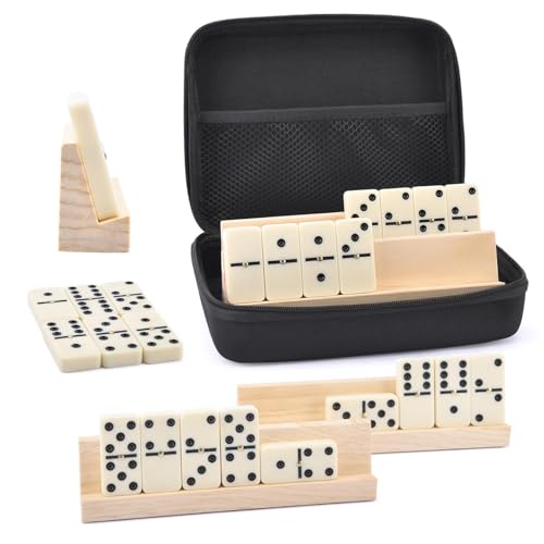 JEJUWE Dominoes Set for Adults with 4 Wood Racks Funny Domino Game Set with 28 Colored Dominos and EVA Case Portable Dominoes Travel Set Complete Dominos Set for Family Board Games !(Style 1)